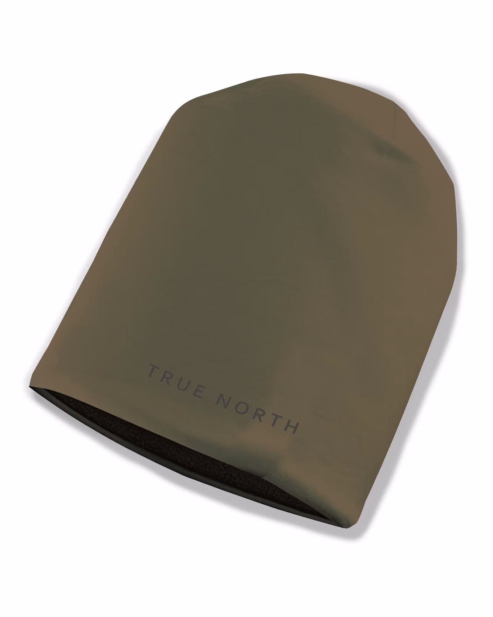 Käännettävä malli tarjoaa kaksi erilaista ilmettä: toisella puolella hillitty logotag, toisella selkeä True North -painatus. Yksi pipo, kaksi tyyliä.