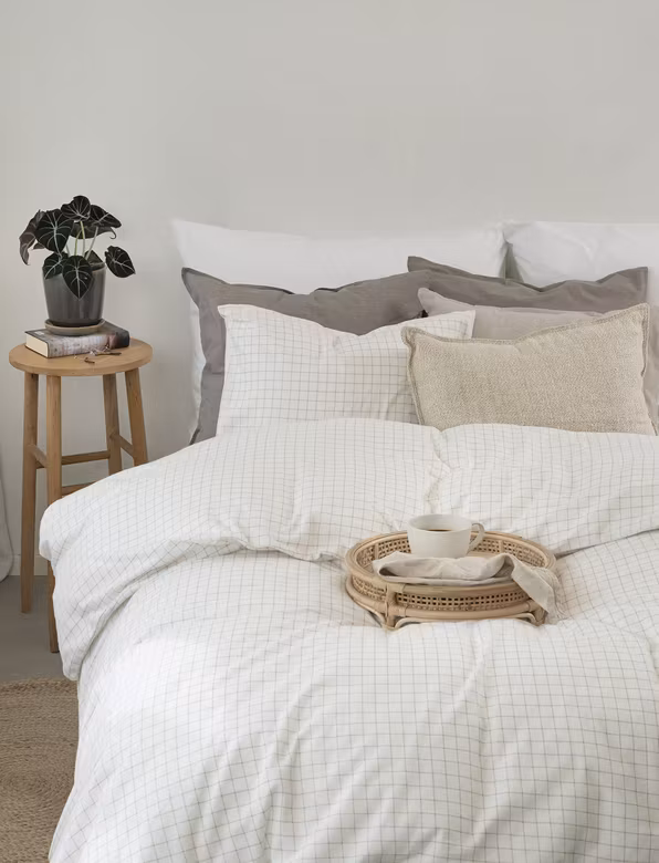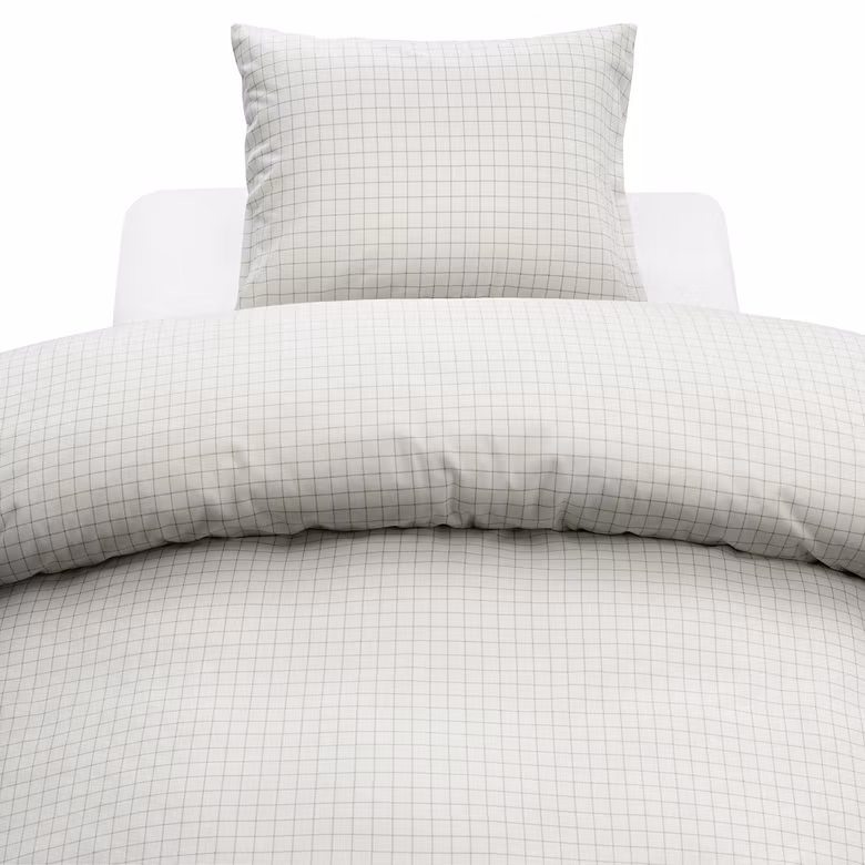 Den neutrala off-white färgen med subtilt rutmönster ger en tidlös och elegant stil som passar in i de flesta inredningar. Påslakanet har praktiska hörnhål som gör bäddningen enklare, och örngottet är designat med en klassisk kuvertöppning. Med OEKO-TEX® Made in Green-certifiering kan du dessutom sova tryggt i vetskap om att textilen är testad och fri från skadliga ämnen.