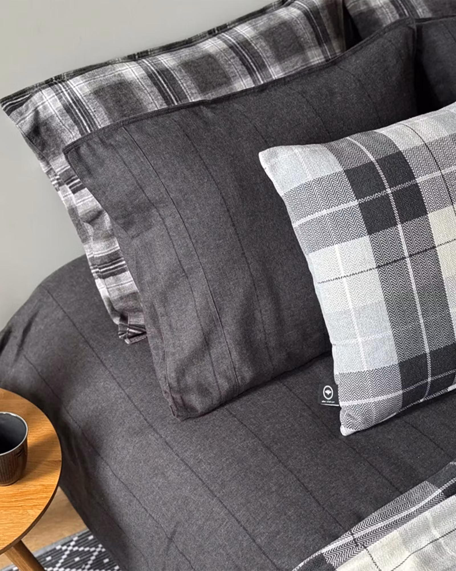Kryp ner i mjuk ekologisk bomullsflanell med det randiga Storuman påslakanset. Den borstade ytan ger en varm och omfamnande känsla, medan den mörkgrå designen s