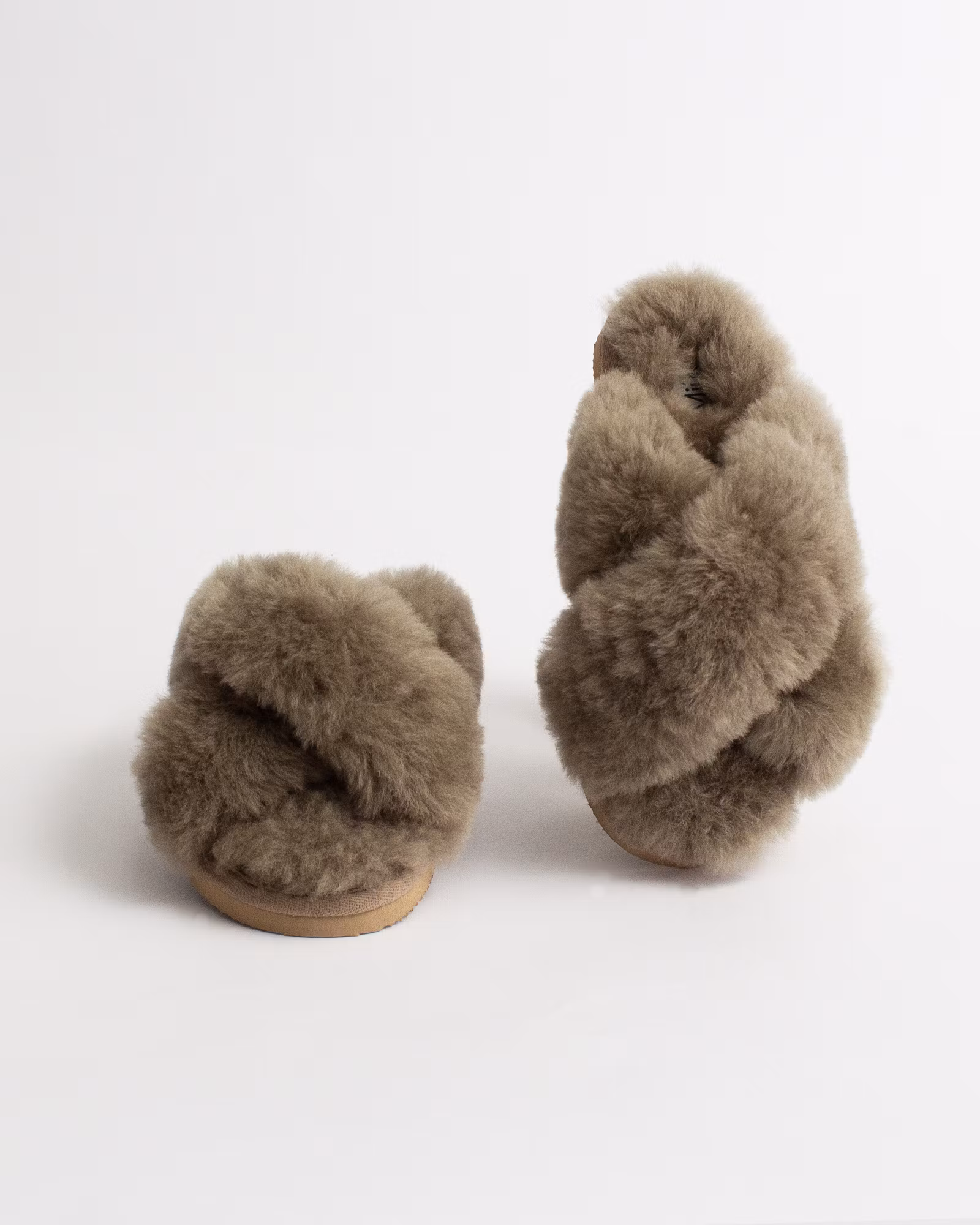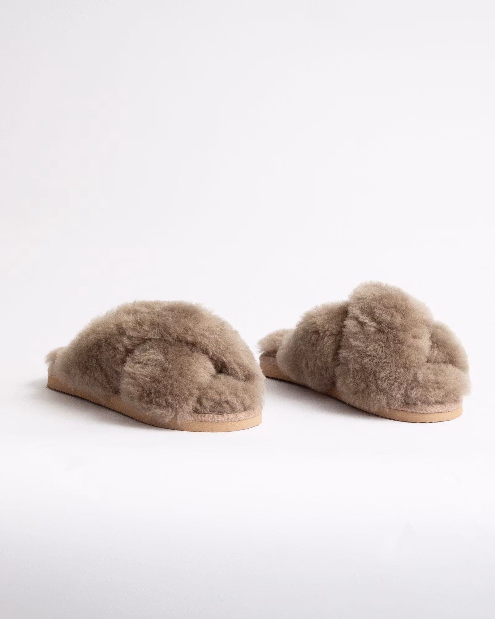 Pehmeät ja ylelliset slip-in tossut avoimella kärjellä tuovat luonnollista lämpöä ja mukavuutta jokaiseen hetkeen. Pitkäkarvaisesta lampaannahasta valmistetut ristikkäiset remmit ja pehmustettu lampaankarvainen sisäpohja tarjoavat lämpimän, syleilevän tunteen – täydelliset viileisiin päiviin.